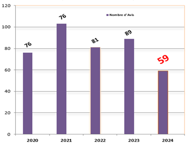 Concernant 2024, les membres du Jury se sont réunis en formation plénière à l’occasion de 12 séances. A l’issue de ces séances, 59 Avis ont été délibérés, rendus et publiés, soit 1/3 de moins qu’en 2023 (89 Avis rendus). Un nombre d’Avis plus faible que lors des 5 dernières années, très proche des 62 Avis publiés en 2018 et des 63 Avis en 2019.