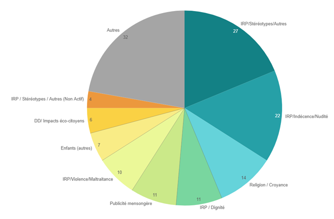 - Ce sont 2 Recommandations déontologiques essentielles qui ont constitué, à proportion égale, le fondement principal des Avis du JDP en 2024: 22 Avis ont été rendus au regard de l’application de la Recommandation « Développement durable » de l’ARPP, 22 Avis ont porté sur la non-conformité à la Recommandation « Image et au respect de la personne ». Les autres Avis ont concerné l’application des dispositions du Code ICC, en particulier les principes de véracité et loyauté (7), celles des Recommandations transversales « Mentions et renvois » et « Publicité de prix » (7 Avis), « Enfant » (3 Avis), « Comportements alimentaires » (1 Avis). Des Recommandations sectorielles telles que « Automobile » et « Deux-roues à moteur » (2), « Alimentation pour animaux familiers » (2 Avis), « Produits cosmétiques » (1) ont également donné lieu à des Avis du Jury.