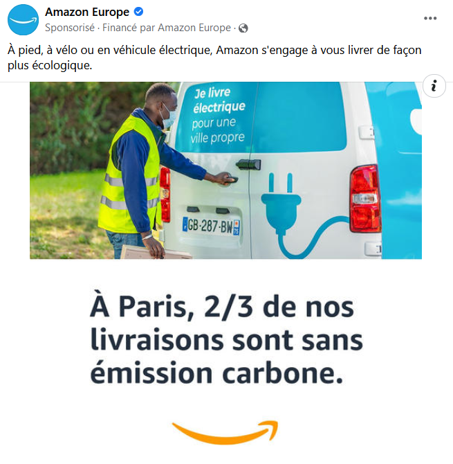 Le texte accompagnant cette image est « A pied, à vélo ou en véhicule électrique, Amazon s’engage à vous livrer de façon plus écologique. A Paris, 2/3 de nos livraisons sont sans émission carbone ».