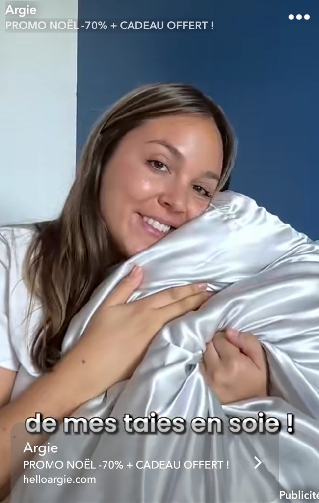 Les textes accompagnant ces images sont « Adopte les taies en soie de la marque Argie », « Grâce à mes taies en soie d’Argie… », « … mes taies en soie… ».