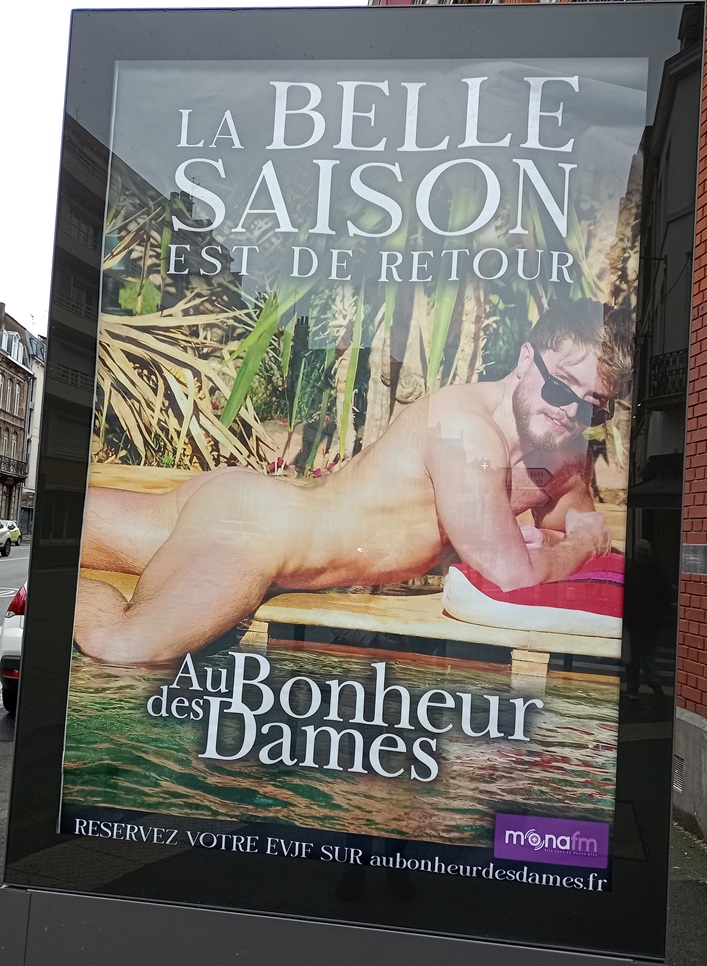 Le Jury relève que la publicité correspond à une affiche exposée sur la voie publique laquelle comporte la photographie en grand format, d’un homme nu, ne portant que des lunettes de soleil, en position allongée sur le ventre, au bord de l’eau et sur un fond végétal. L’affiche annonce : « La belle saison est de retour » et, en-dessous : « Au bonheur des dames » puis, en bas d’affiche et en plus petit : « réservez votre EVJF sur aubonheurdesdames.fr ».