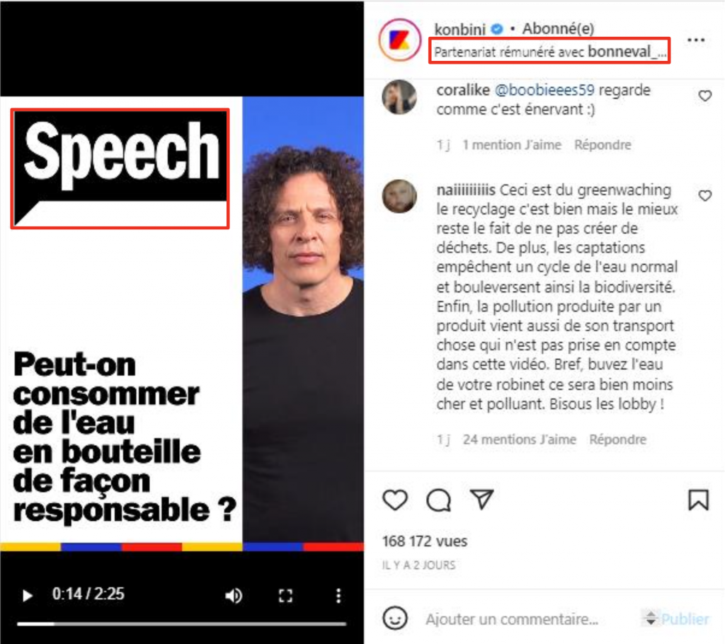 Konbini présente cette vidéo sous le titre « Speech » comme s’il s’agissait d’une simple prise de parole à propos d’une question : « Peut-on consommer de l’eau en bouteille de façon responsable ? ». En vérité, c’est une question rhétorique, puisque seul le directeur général de Bonneval s’exprime dans cette vidéo. En outre, il n’y présente que les prétendus avantages de la consommation d’eau minérale en bouteille. C’est évidemment une auto-promotion, une pure publicité, dont le caractère commercial n’est pas très apparent.
