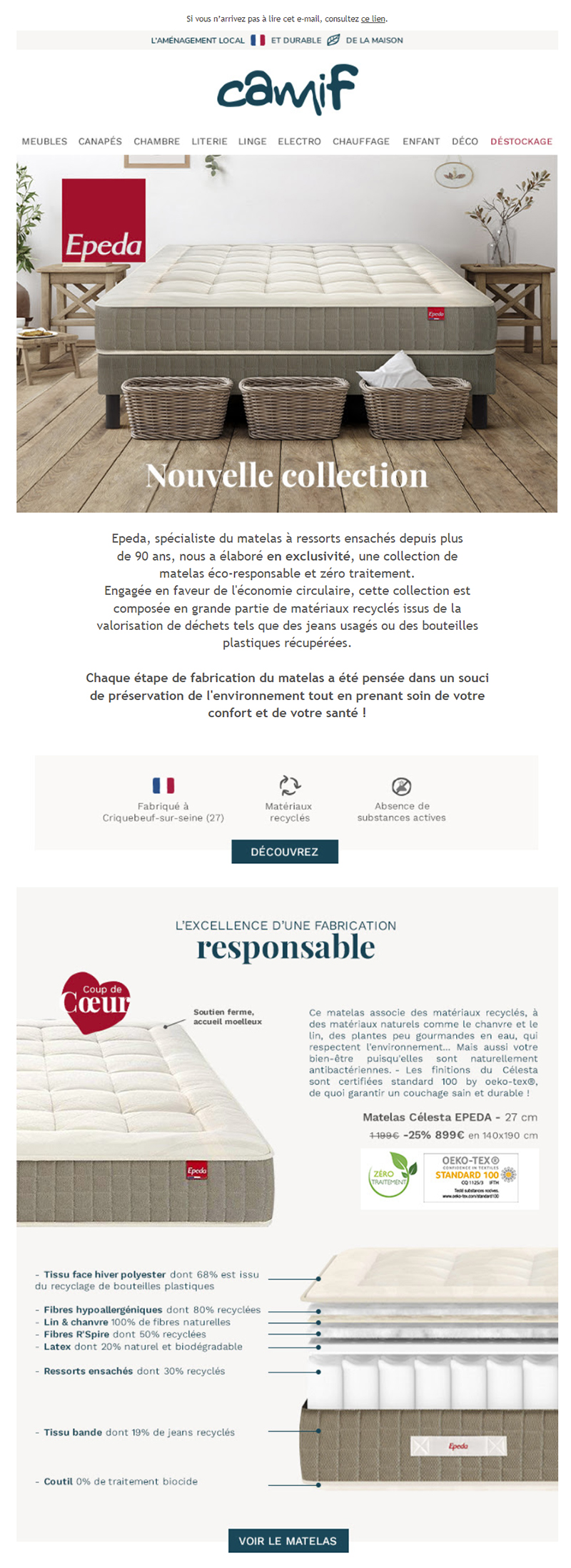 Le texte situé en-dessous de l’image est « Epeda, … Une collection de matelas éco-responsable et zéro traitement. Engagée en faveur de l’économie circulaire, cette collection est composée en grande partie de matériaux recyclés issus de la valorisation de déchets tels que des jeans usagés ou des bouteilles plastiques récupérées. », « Chaque étape de fabrication du matelas a été pensée dans un souci de préservation de l’environnement tout en prenant soin de votre confort et de votre santé », « L’excellence d’une fabrication responsable », « Ce matelas associe des matériaux recyclés à des matériaux naturels comme le chanvre et le lin » …