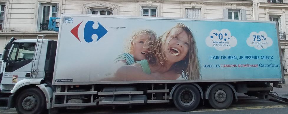 En décalage avec la communication sur ses camions, sur son site internet, Carrefour fait mention d’une réduction de 99,3% des particules fines liées au biométhane carburant. La mention « 0 émission de particules fines » renvoie l’image d’un moyen de livraison avec une absence d’impact sur la qualité de l’air, ce qui est faux.