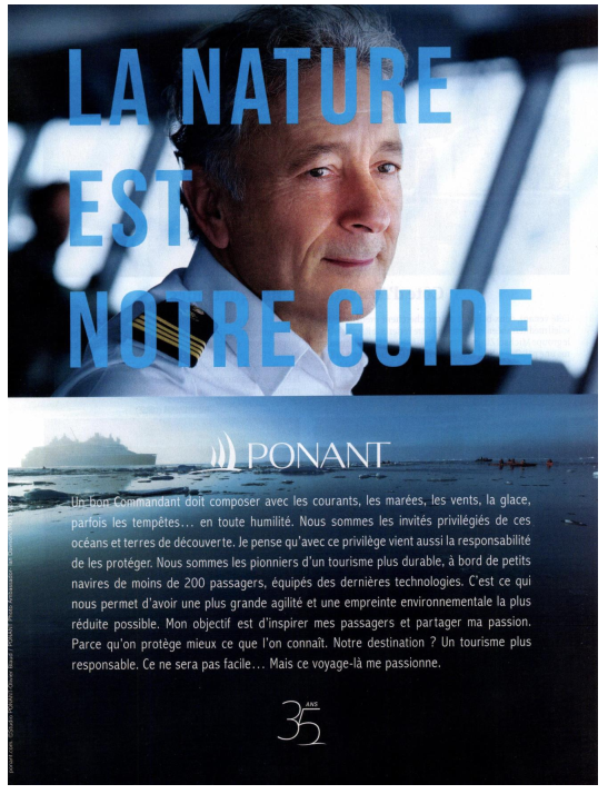• dans sa partie haute, la photographie d’un commandant de navire de croisière sur laquelle est apposée la phrase « La nature est notre guide » ;