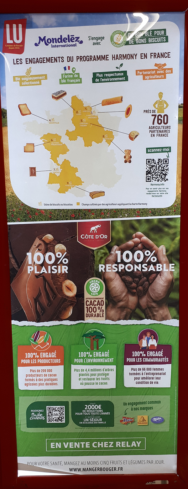 Les messages « 100 % durable », « 100 % responsable », « 100 % engagé » correspondent aux actions entreprises par Mondelēz dans le cadre de son programme Cocoa Life.