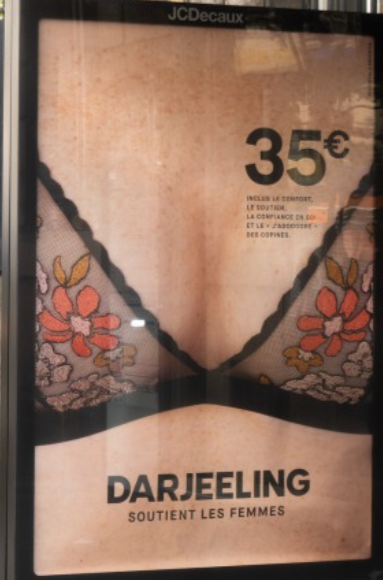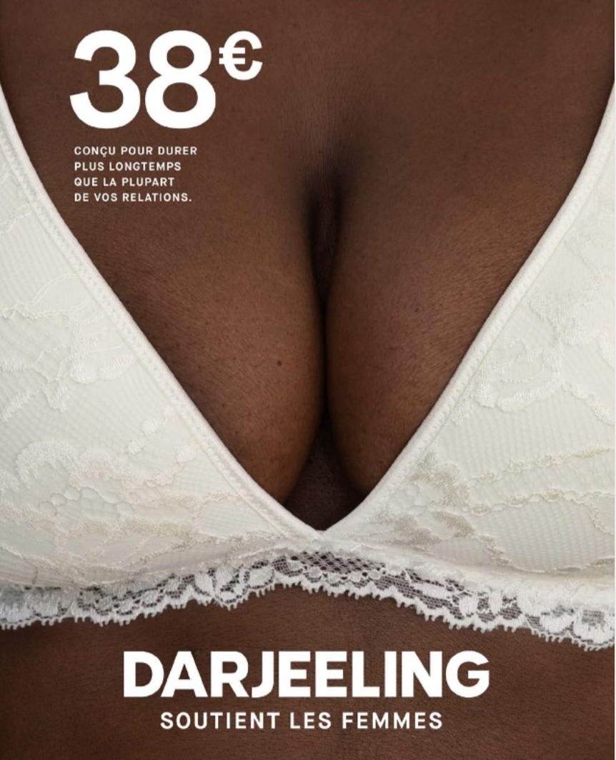 En effet, les visuels mettent en avant l’essentiel, à savoir les modèles de soutiens-gorges      Darjeeling, accessibles à toutes les femmes et adaptés aux différentes morphologies.  Le parti pris et choix délibéré de la conception graphique consiste à présenter, dans un cadrage serré, les produits Darjeeling portés par tous types de poitrines afin que toute consommatrice puisse s’identifier à ces produits et se sentir représentée.
