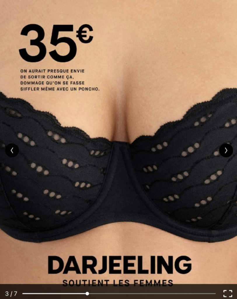En effet, les visuels mettent en avant l’essentiel, à savoir les modèles de soutiens-gorges Darjeeling, accessibles à toutes les femmes et adaptés aux différentes morphologies. Le parti pris et choix délibéré de la conception graphique consiste à présenter, dans un cadrage serré, les produits Darjeeling portés par tous types de poitrines afin que toute consommatrice puisse s’identifier à ces produits et se sentir représentée.