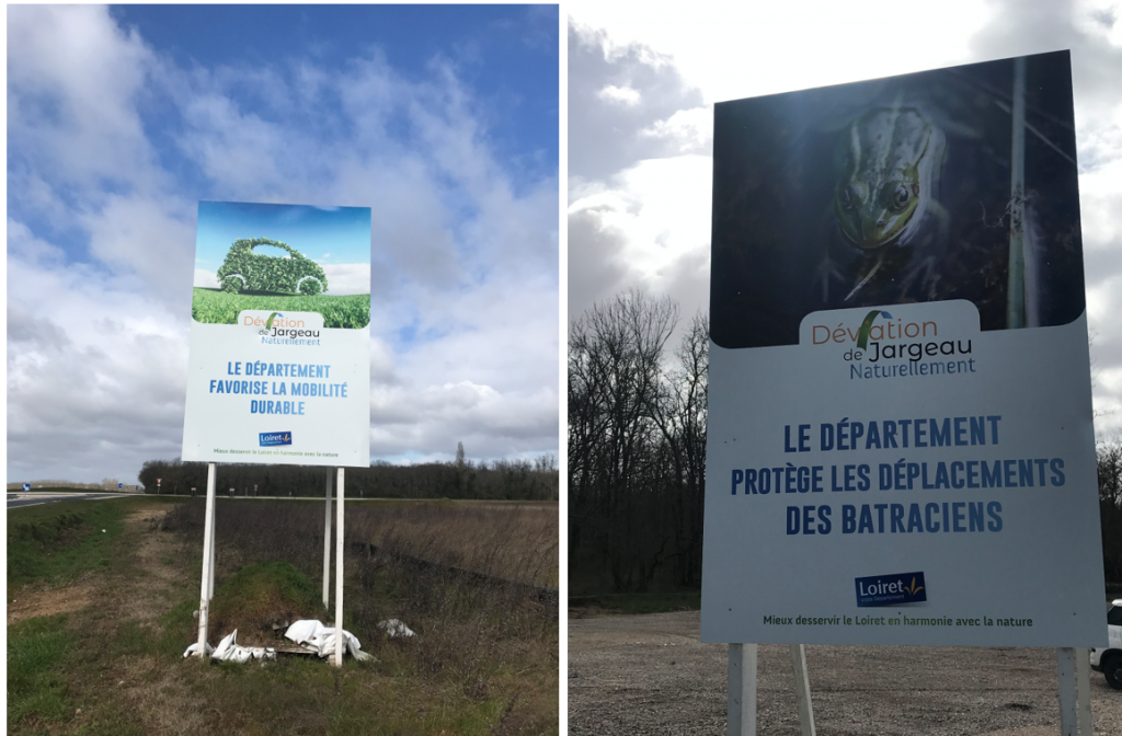 – Le plaignant considère que ces panneaux, dont le slogan est « Déviation de Jargeau, Naturellement », prétendent valoriser une « mobilité durable », en recourant au visuel d’une voiture constituée de feuilles, et la protection des grenouilles, alors qu’il s’agit d’une déviation routière qui nécessite la destruction de plusieurs hectares de forêt, la construction d’un pont sur la Loire dans une zone « Natura 2000 » classée au patrimoine mondial de l’Unesco, qui va générer le passage de milliers de poids lourds et inciter à l’implantation de nouvelles plateformes logistiques sur des terres majoritairement agricoles. La protection des batraciens a consisté, concrètement, à poser tardivement une barrière plastique de 20 cm de haut, souvent tombée au sol.
