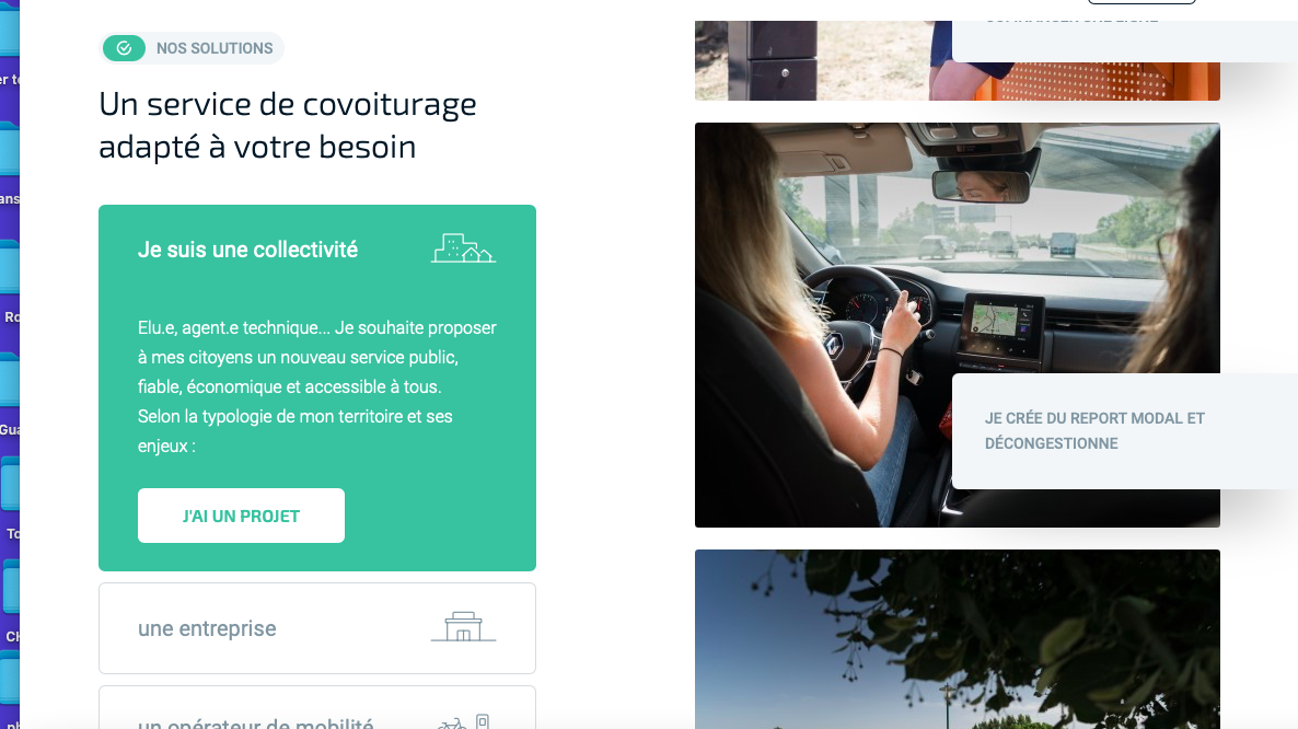 • Sur le message « je crée du report modal » , il s’agit, selon Ecov, d’une invitation faite aux collectivités territoriales d’adopter ses solutions en fonction des objectifs visés. En outre, dans ce contexte, le « report modal » s’entend logiquement comme le transfert de l’autosolisme au covoiturage (c’est-à-dire de conducteur à passager), tel qu’il est précisé à diverses reprises sur le site d’Ecov. Il y est par exemple indiqué que ses solutions sont pensées « pour permettre un report de l’autosolisme et un parcours multimodal (liaison avec des transports collectifs) ».