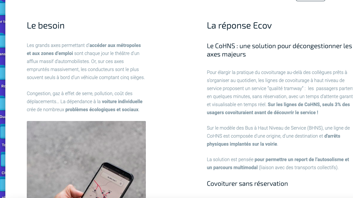 • D’autre part, Ecov propose une solution de covoiturage « à haut niveau de service » (« CoHNS »), qui vise à « réduire le nombre de voitures en circulation sur les grands axes routiers » qui permettent « d’accéder aux métropoles et aux zones d’emploi » et sont quotidiennement « empruntés massivement », le plus souvent par des conducteurs « seuls à bord d’un véhicule comptant cinq sièges ».
