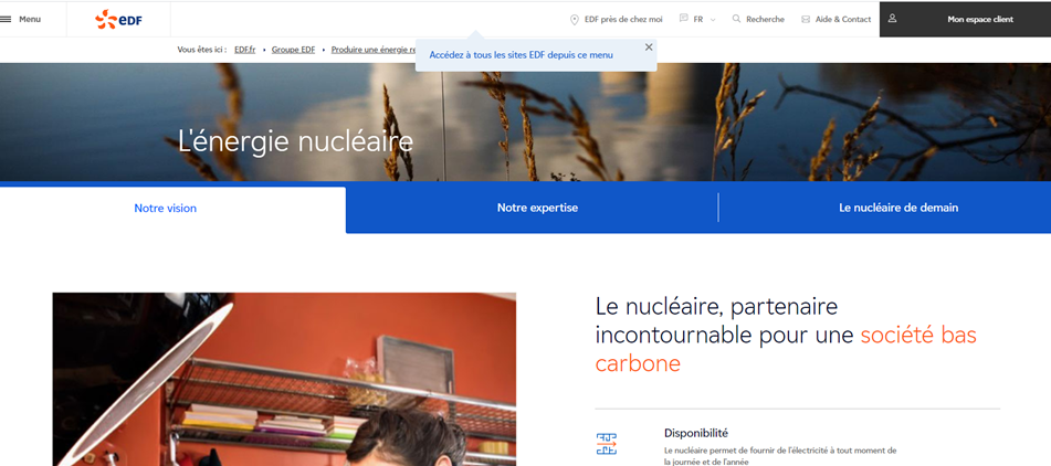 Cette communication consiste en une page du site internet de l’entreprise intitulée : « L’énergie nucléaire », qui comporte le texte : « Le nucléaire, partenaire incontournable pour une société bas carbone ». Plusieurs qualificatifs sont associés au nucléaire, notamment « Disponibilité : Le nucléaire permet de fournir de l’électricité à tout moment de la journée et de l’année », « Compétitivité : Grâce au nucléaire, le kWh en France est en moyenne 40 % moins cher que chez nos voisins européens », « Respect du climat : l’électricité produite à partir du nucléaire n’émet pas de CO2 », « Sûreté : Les centrales nucléaires françaises sont les installations industrielles les plus contrôlées et protégées » et « Indépendance énergétique : la part prépondérante du nucléaire dans le mix énergétique permet l’indépendance énergétique du pays ».