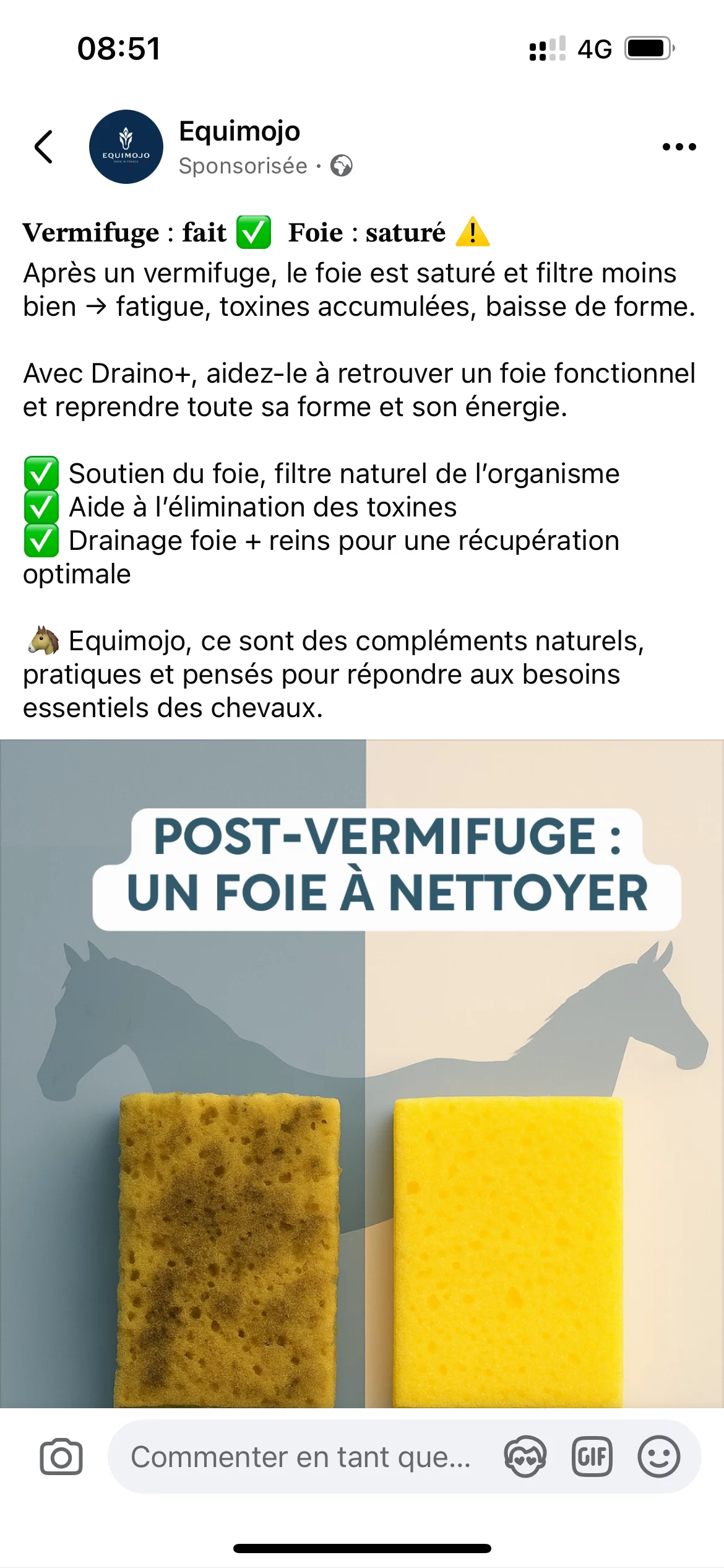 Sur le visuel utilisé et le ton du message, il s’agissait d’une image à visée pédagogique, destinée à sensibiliser visuellement les propriétaires au rôle du foie pendant la vermifugation. En aucune façon Equi-mojo n’a voulu dire : « voici le foie de votre cheval tel qu’il sera après un vermifuge » (sous-entendu, nécrosé ou pathologique). L’image se voulait métaphorique, pour attirer l’attention sur ce « héros discret » qu’est le foie dans l’organisme.