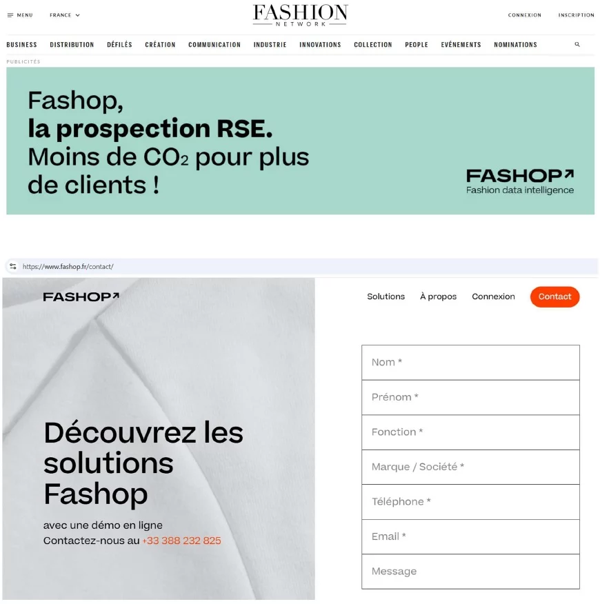 Il ajoute que, quand on clique sur le visuel publicitaire, on arrive sur la page https://www.fashop.fr/contact/ qui comporte une accroche textuelle « Découvrez les solutions Fashop » et un formulaire de contact. Il n’y a pas d’éléments justificatifs ni d’explications sur les caractéristiques des services proposés par Fashop relativement aux enjeux de soutenabilité.