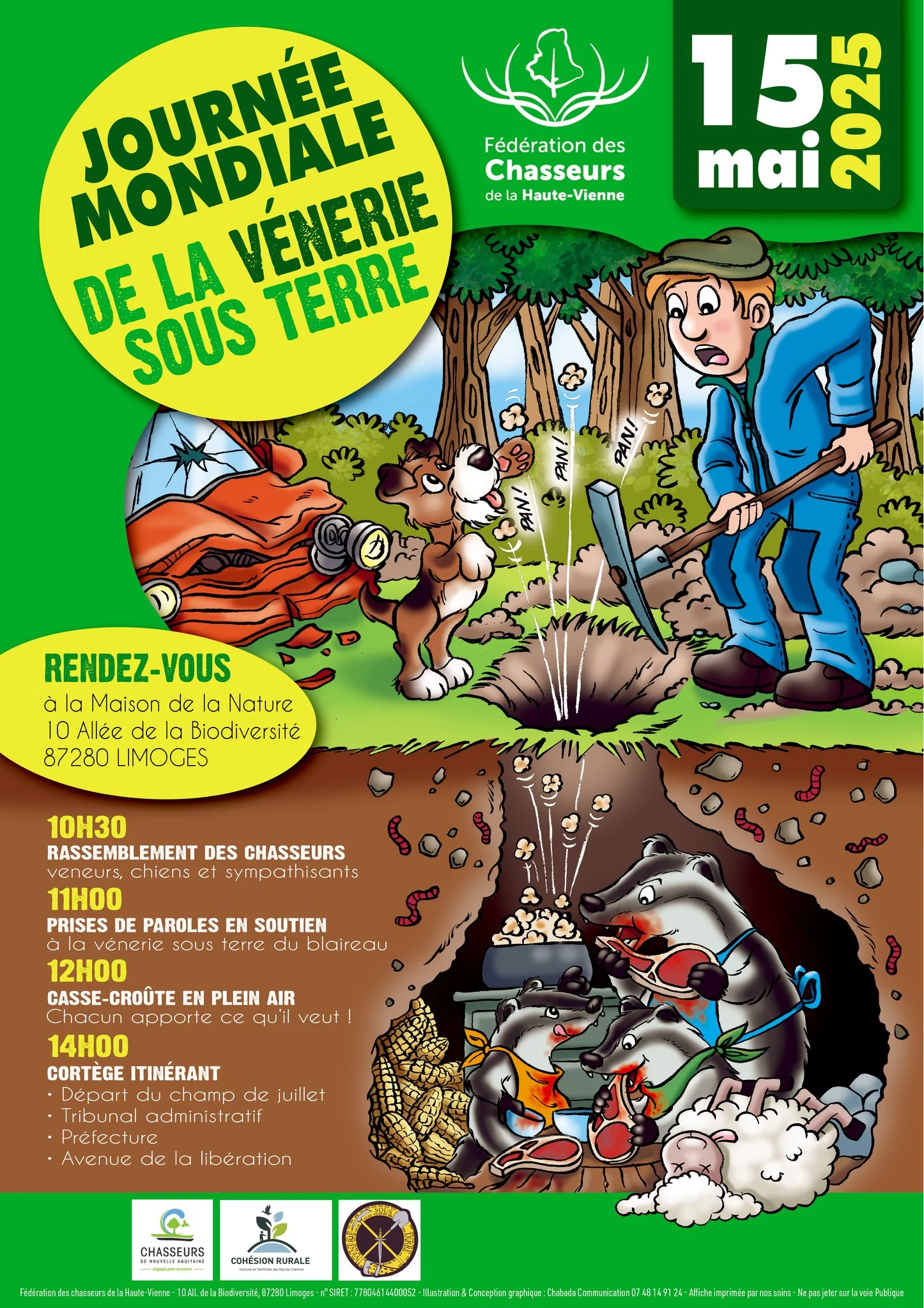 Les textes accompagnant cette image sont : « Journée mondiale de la vénerie sous terre – 15 mai 2025 », « Rendez-vous à la Maison de la Nature… » ainsi que diverses informations relatives à l’organisation de l’évènement.