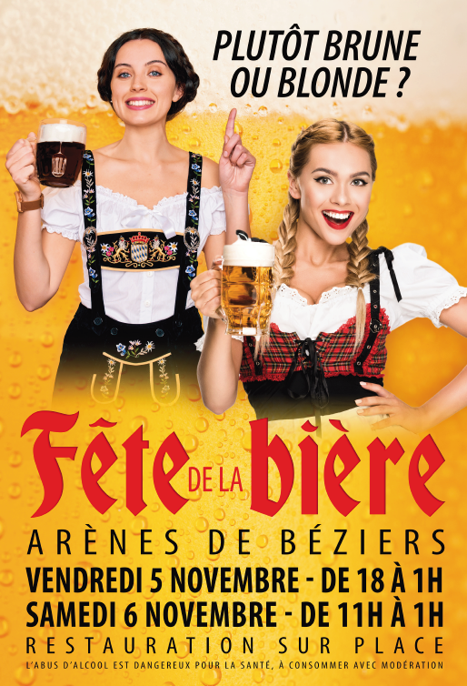 Cette image est accompagnée des textes « Plutôt brune ou blonde ? », « Fête de la bière – Arènes de Béziers » suivis des informations pratiques de l’évènement.