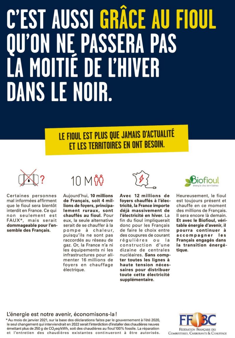 - dans la première colonne, il est notamment indiqué : « Certaines personnes mal informées affirment que le fioul sera bientôt interdit en France… serait dommageable pour l’ensemble des Français… »