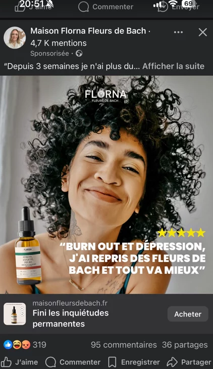 Une autre publicité, en faveur du produit « Stress, anxiété, peurs », montre une jeune femme souriante, déclarant « Burn out et dépression, j’ai repris des fleurs de Bach et tout va mieux ».