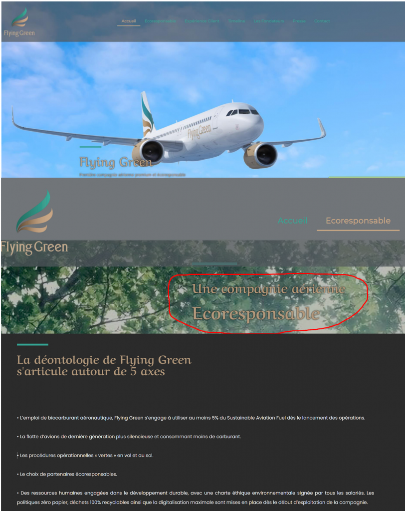 « première compagnie aérienne écoresponsable ». Le site internet auquel il renvoie évoque quant à lui une « compagnie aérienne écoresponsable ».