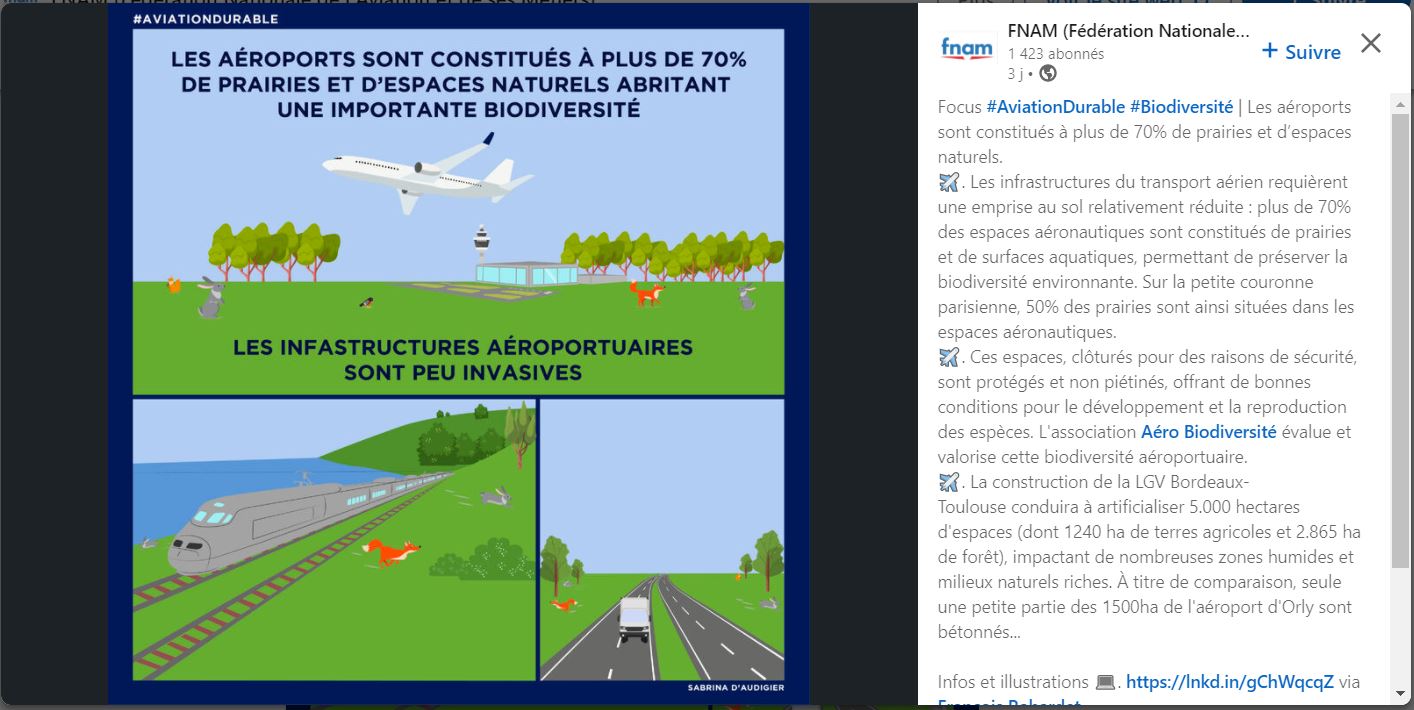 Le texte accompagnant ces visuels est « Focus #Aviationdurable #Biodiversité », « Les aéroports sont constitués à plus de 70% de prairies et d’espaces naturels abritant une importante biodiversité », « Les infrastructures aéroportuaires sont peu invasives », « Les infrastructures du transport aérien requièrent une emprise au sol relativement réduite : plus de 70 % des espaces aéronautiques sont constitués de prairies et de surfaces aquatiques, permettant de préserver la biodiversité environnante (…) », « Ces espaces (…) offrant de bonnes conditions pour le développement et la reproduction des espèces. L’association Aéro Biodiversité évalue et valorise cette biodiversité aéroportuaire ». Il est en outre précisé que « La construction de la LGV Bordeaux-Toulouse conduira à artificialiser 5000 hectares d’espaces (…) impactant de nombreuses zones humides et milieux naturels riches. A titre de comparaison, seule une petite partie des 1500 ha de l’aéroport d’Orly sont bétonnés ».