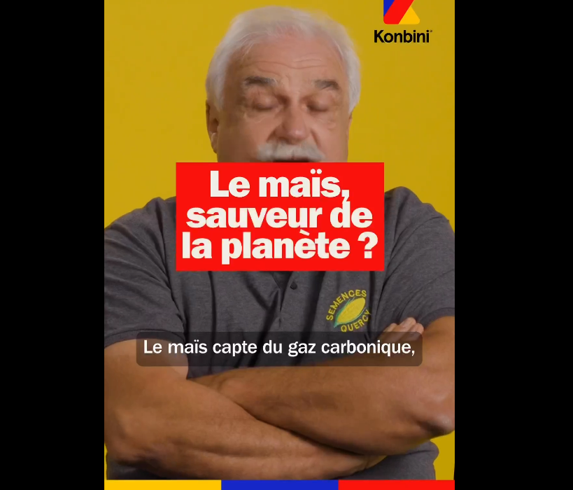 Les textes apparaissant en incrustation à l’écran sont : « Le maïs, sauveur de la planète ? », « Le maïs capte du gaz carbonique, le met dans le sol et en plus il sert à alimenter l’humanité toute entière », « Le maïs, c’est vraiment la céréale qui va capter le plus de CO² et elle va pouvoir le stocker dans les sols. », « par le mécanisme de la photosynthèse, elle va pouvoir capter ce CO² aussi bien voire mieux qu’un hectare de forêt »,