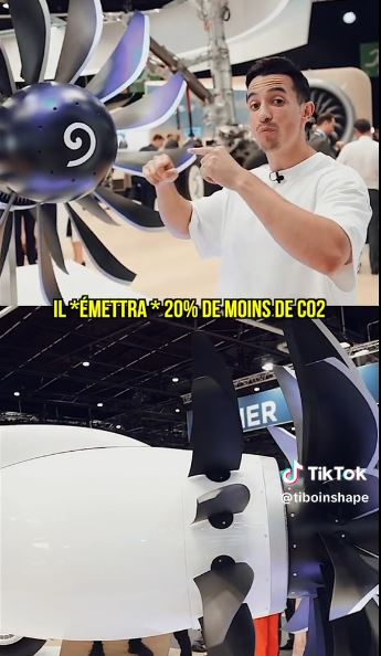 Sur le premier « screenshot » « Il *émettra* 20% de moins de CO2 », Tibo InShape évoque les prévisions de réduction de CO2 calculées par Safran (-20% par rapport au moteur LEAP) sur la base des explications apportées par l’expert Thibaud Normand (Directeur Climat chez Safran) présent sur le stand d’exposition. En effet, la maquette du démonstrateur présentée par l’influenceur fait partie du programme RISE (Revolutionary Innovation for Sustainable Engines), un programme de développement technologique qui vise à poser les bases de la prochaine génération de moteurs. Safran précise dans son dossier de presse sur les défis climatiques publié en juin 2023 que ce projet technologique servira de fondement au développement d’un futur moteur 20% plus sobre en carburant que le moteur de dernière génération LEAP et 100% compatible avec des carburants durables.