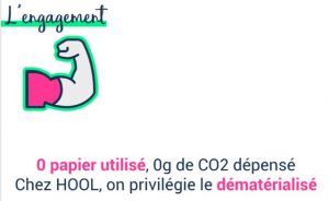 - Engagement : Hool favorise le dématérialisé et n’utilise aucun papier, évitant ainsi l’émission de CO2.