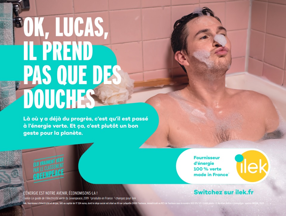 Cette image est accompagnée des textes : « Ok, Lucas, il prend pas que des douches », « Là où il y a déjà un progrès, c’est qu’il est passé à l’énergie verte. Et ça, c’est plutôt un bon geste pour la planète », « Elu vraiment vert par le classement Greenpeace », « Fournisseur d’énergie 100% verte made in France », « l’énergie est notre avenir, économisons là ! ».