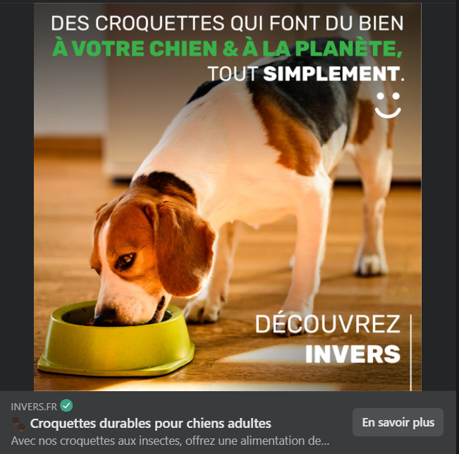 Le Jury de Déontologie Publicitaire a été saisi, le 28 octobre 2021, d’une plainte émanant d’un particulier, tendant à ce qu’il se prononce sur la conformité aux règles déontologiques en vigueur d’une publicité diffusée sur la page Facebook de la société Invers, pour promouvoir son offre de produits d’alimentation pour chiens et chats.