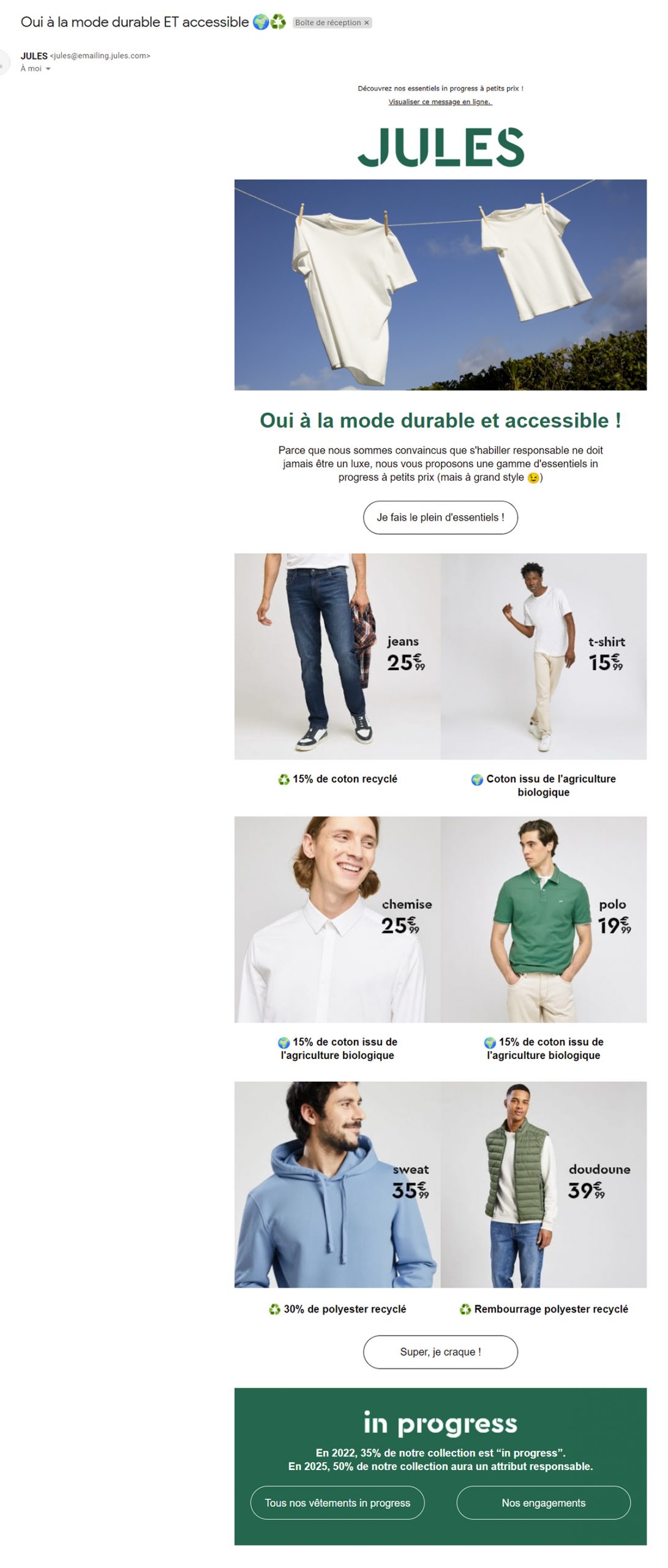 Le Jury relève que la publicité en cause fait la promotion de vêtements sous la bannière « Oui à la mode durable et accessible ! », explicitée par la formule « Parce que nous sommes convaincus que s’habiller responsable ne doit jamais être un luxe, nous vous proposons une gamme d’essentiels à petits prix […] ».
