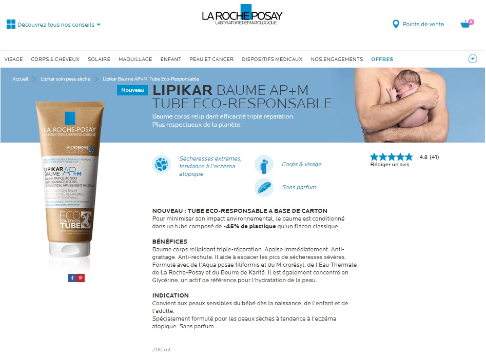 Cet emballage présente l’une des plus faibles empreintes carbone de tubes cosmétiques et utilise 45% de plastique de moins qu’un tube plastique moyen. Le visuel tronqué communiqué au soutien de la plainte occulte cette partie informative et explicative de la démarche de LA ROCHE POSAY, disponible sur son site internet : https://www.laroche-posay.fr/produits-soins/lipikar-soin-peau-seche/lipikar-baume-ap-m-tube[1]eco-responsable-p27632.aspx.