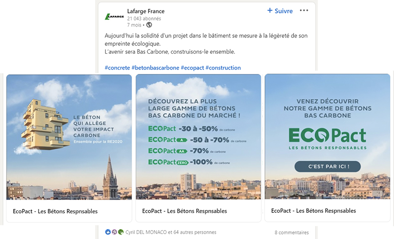 Les textes accompagnant ces images sont : « Aujourd’hui la solidité d’un projet dans le bâtiment se mesure à la légèreté de son empreinte écologique. L’avenir sera Bas Carbone, construisons-le ensemble… #concrete #betonbascarbone #ecopact #construction », « Le béton qui allège votre impact carbone », « découvrez la plus large gamme de bétons bas carbone du marché ! », « EcoPact -30 à – 50% de carbone, EcoPact A -50 à – 70% de carbone, EcoPact AA – 70% de carbone, EcoPact Zéro -100% de carbone » ainsi que : « ECOPact Les bétons responsables, c’est par ici !», le terme ECOPact étant inscrit en très gros caractères, en vert.