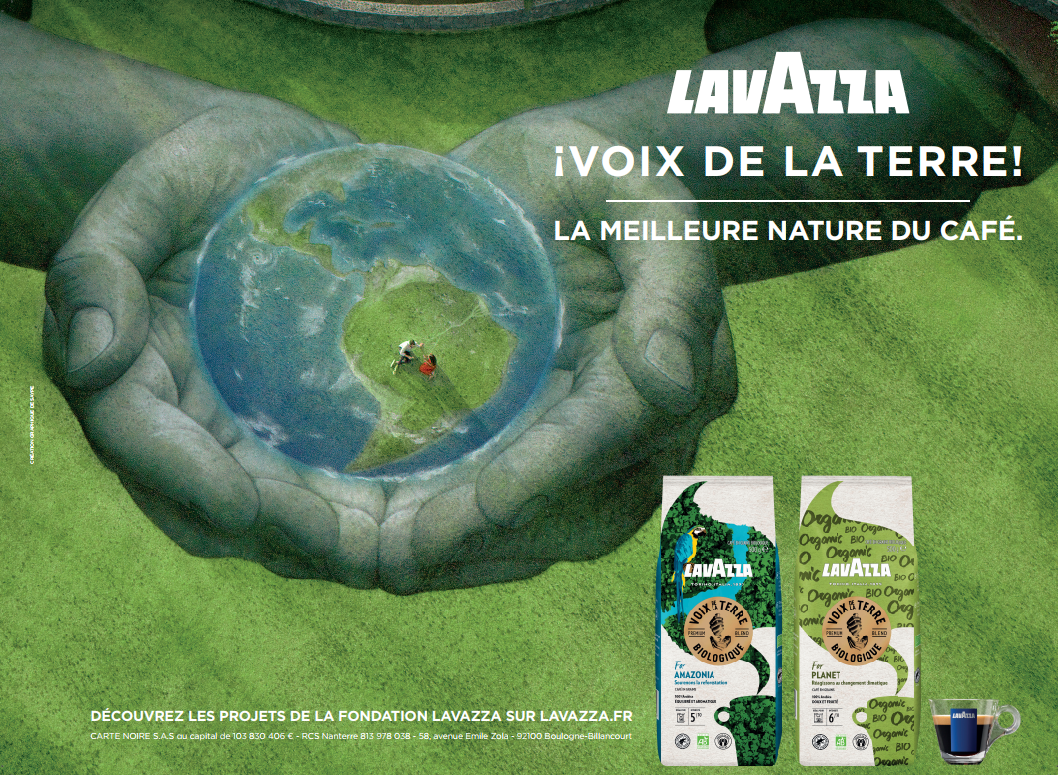 Les textes accompagnant ces visuels sont « Lavazza Voix de la Terre !la meilleure nature du café » et « Découvrez les projets de la fondation Lavazza sur lavazza.fr ».