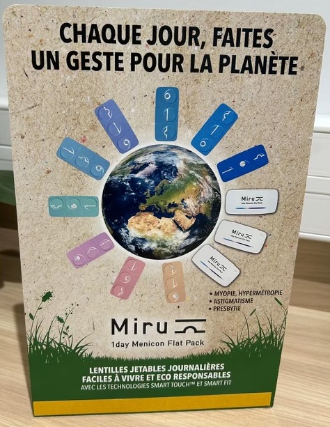 100% du packaging concerne la lentille Menicon Miru 1day Flat Pack est conçu à partir de plastique recyclé. L’emballage contient également 80%de plastique en moins comparé aux méthodes traditionnelles de packaging et 99% du plastique utilisé dans le processus de fabrication est recyclé.