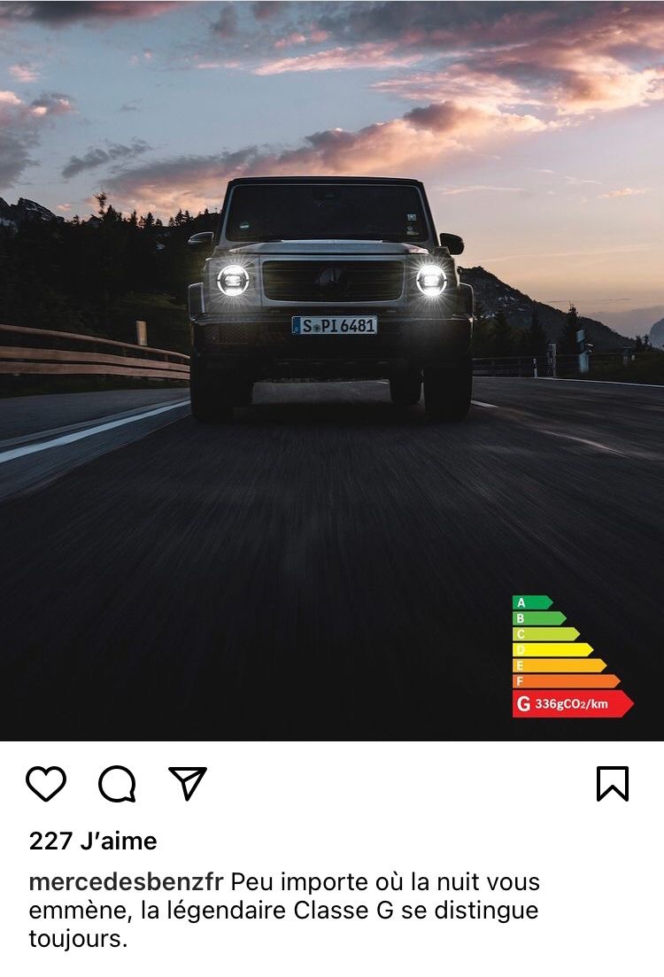Il reproche au post Instagram en cause de faire « une publicité pour un véhicule classé G en terme de consommation d’essence. En pleine sobriété demandée par l’Etat. Avec un claim radical : peu importe où la nuit vous emmène, la classe G se distingue toujours ».