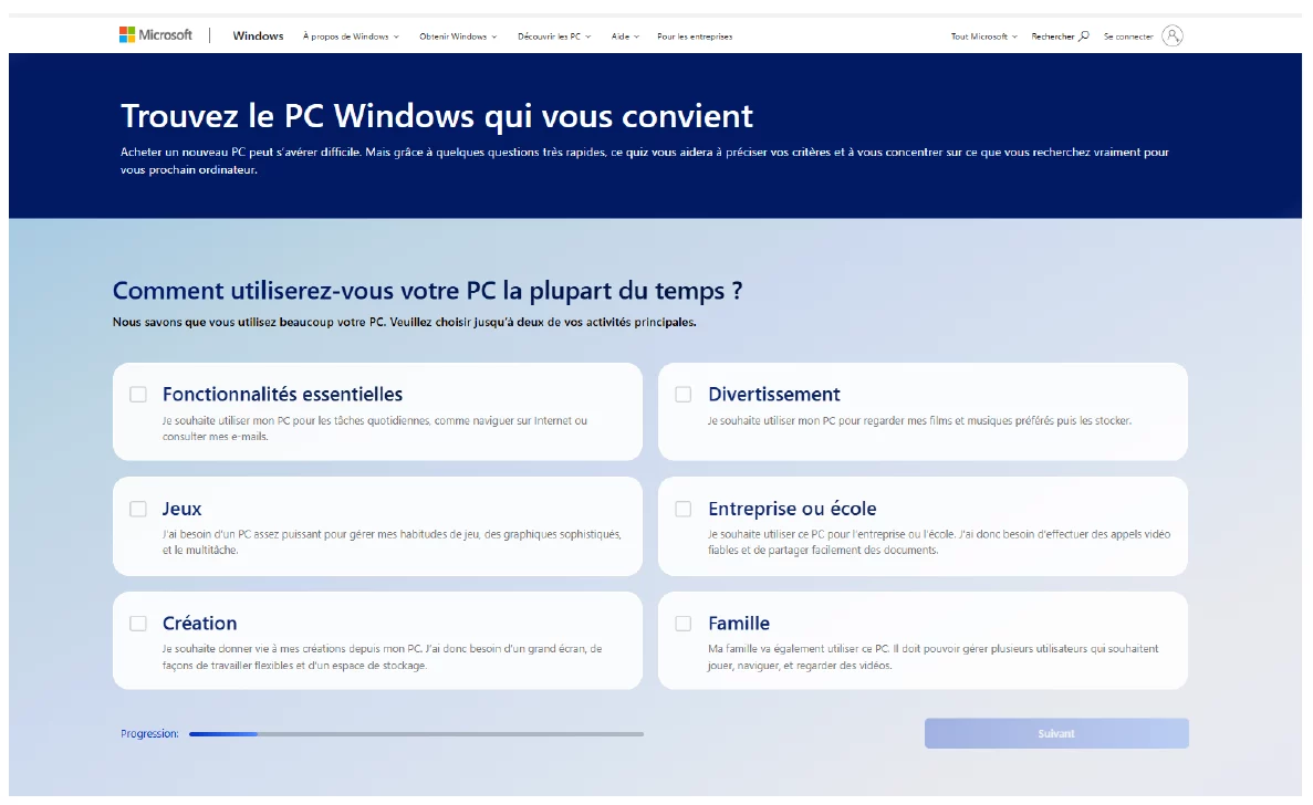 La page renseigne ensuite sur la date de fin du « support de Windows 10 » puis développe une comparaison entre ce dernier et le nouveau « Windows 11 » puis invite le lecteur : « Découvrez les nouvelles fonctionnalités de Windows et faites-vous aider pour choisir l’ordinateur le plus adapté à vos besoins. »