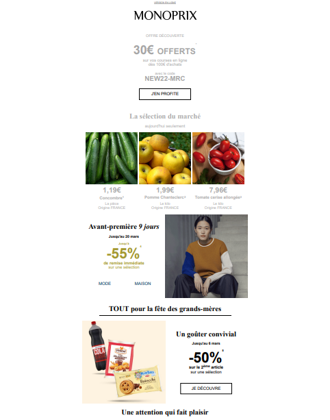 Le texte accompagnant cette image est : « Un goûter convivial – Jusqu’au 6 mars -50% sur le 2ème article sur une sélection », « Une attention qui fait plaisir ».
