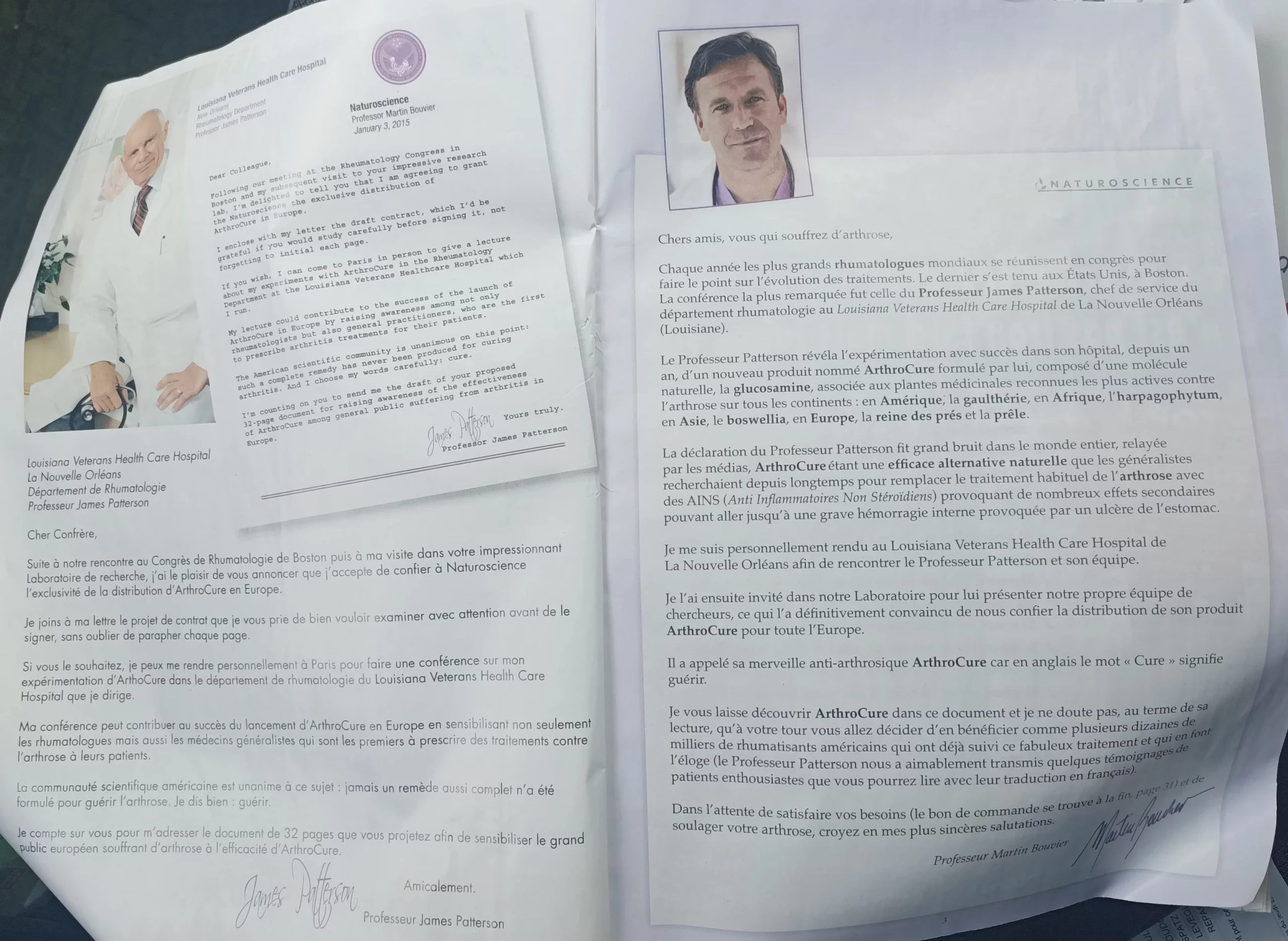 Ainsi que des courriers présentés comme émanant de scientifiques/rhumatologues – deux hommes en blouse blanche dont l’un avec un stéthoscope à la main – déclarant approuver les bienfaits du produit Arthrocure :