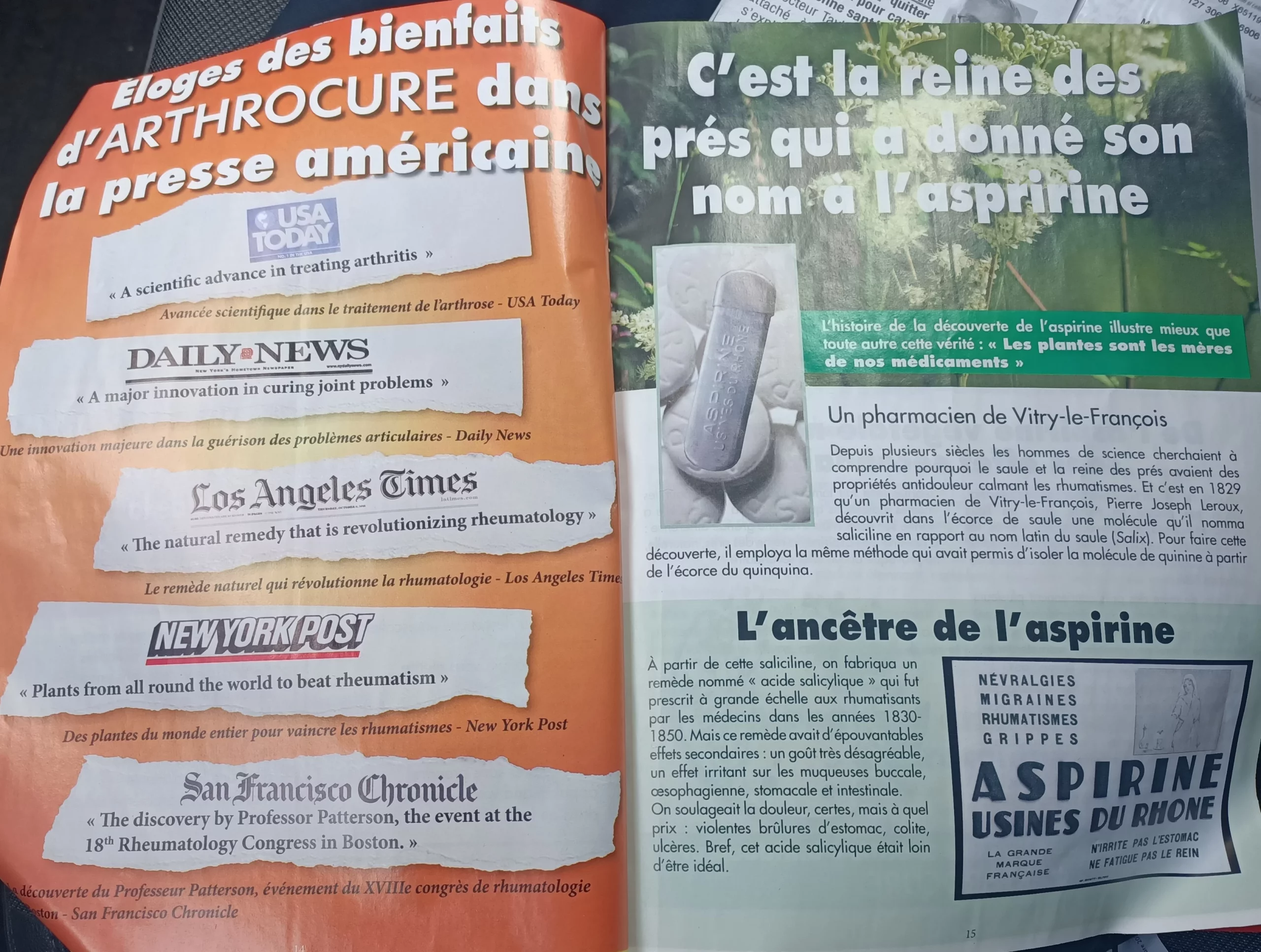 – Le plaignant énonce que le fascicule en cause présente une solution vainquant l’arthrose selon la recette d’un « grand rhumatologue américain » (un professeur James Patterson). Il prétend guérir l’arthrose dans un long document (plus de 30 pages) vantant des molécules venant de la médecine ayurvédique, native américaine, d’une autre découverte par un prix Nobel, qui seraient la base de ce produit miracle.