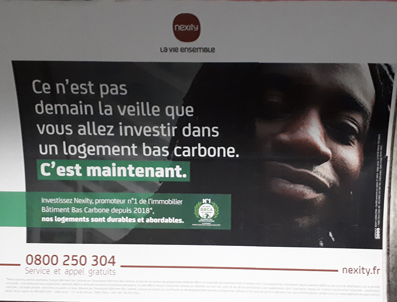 – La société d’affichage Médiatransports indique que le visuel objet de la plainte qui promeut l’investissement dans les bâtiments Nexity dits « bas carbone » et « durables et abordables » a été affiché du 10 février au 16 février 2022 sur 180 faces des réseaux RATP et SNCF.