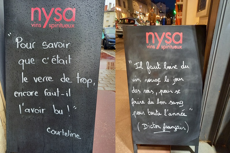 Le Jury relève que le panneau d’affichage en cause, exposé devant le point de vente d’une épicerie fine, comporte deux textes, inscrits à la craie blanche : « Il faut boire du vin rouge le jour des rois, pour se faire du bon sang toute l’année (dicton français) » puis « Pour savoir que c’était le verre de trop, encore faut-il l’avoir bu (Courteline) ».