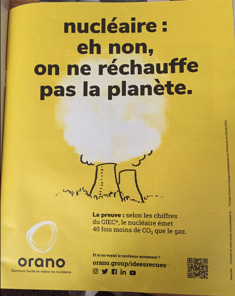 Il en est de même concernant la publicité parue dans la presse papier, qui met en avant l’affirmation « Nucléaire : eh non, on ne réchauffe pas la planète ». Or, il est constant que la production d’énergie, quelle qu’elle soit, implique nécessairement de tels dégagements gazeux. Le contenu en CO₂ du nucléaire a d’ailleurs fait l’objet d’une méta-étude, qui débouche sur un chiffre médian de 66g de CO₂ par KWh.