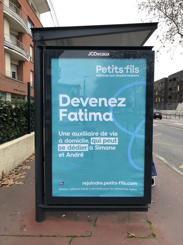 La publicité en cause, diffusée en affichage, utilise le texte, en gros caractères, sur fond bleu : « Devenez Fatima – Une auxiliaire de vie à domicile, qui peut se dédier à Simone et André ».