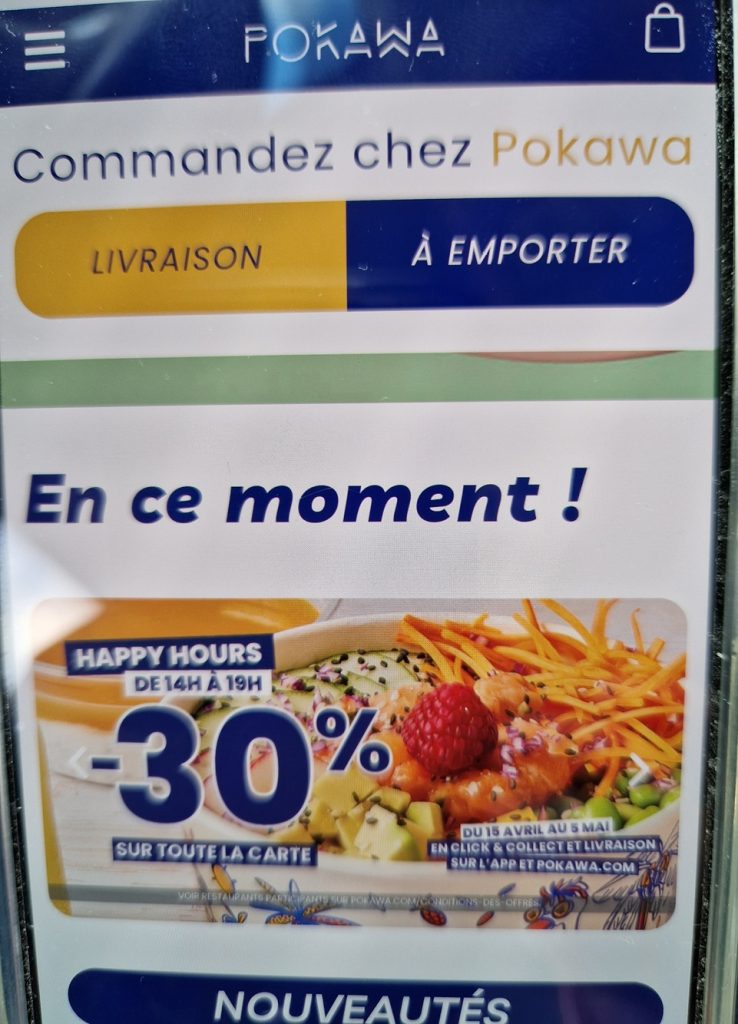 La publicité en cause, diffusée sur le site internet de la société Pokawa et son application mobile, propose une offre promotionnelle annonçant : « En ce moment ! Happy hours de 14h à 19h – 30% sur toute la carte ».