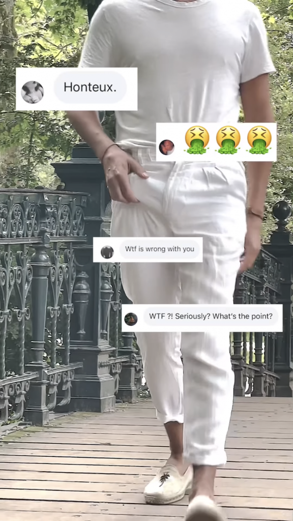 La vidéo publicitaire en cause, diffusée sur le compte Instagram de la marque, montre un homme vêtu d’un tee-shirt et d’un pantalon blanc, marchant dans un parc. Il porte à plusieurs reprises la main au niveau de son bas-ventre et touche un « objet » par-dessus le pantalon ou en mettant sa main dans sa poche. La fin de la vidéo le montre sortant un étui à lunettes de la poche du pantalon.