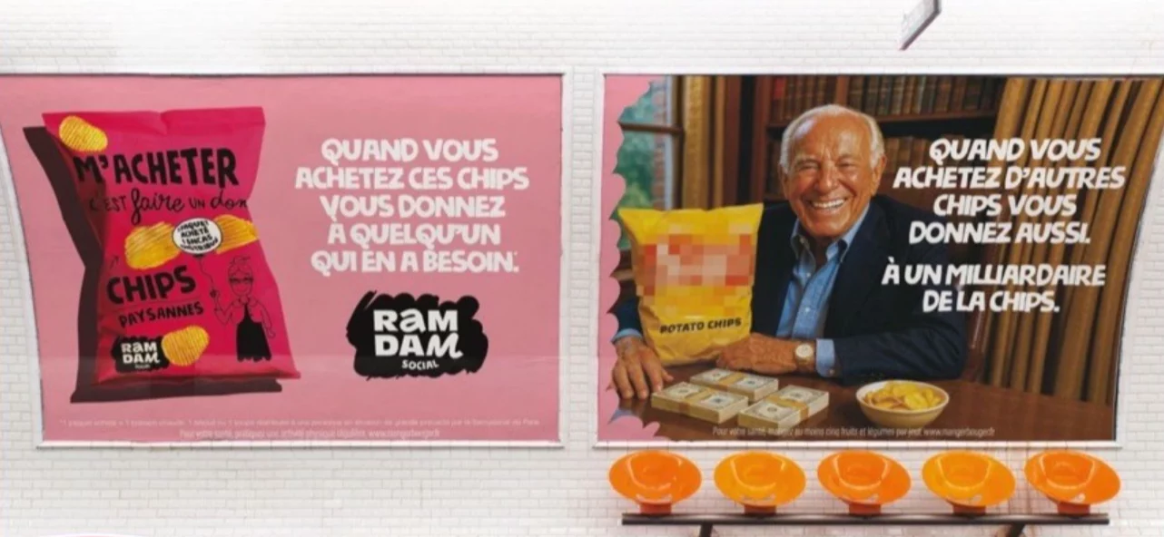 En effet, l’annonceur a pour spécificité de reverser une part de la vente de chaque produit qu’il distribue à une association caritative (pour ce produit, le Samusocial de Paris). Le slogan « Quand vous achetez d’autres chips, vous donnez aussi. A un milliardaire de la chips. » vient amplifier celui concernant le produit Ramdam Social, « Quand vous achetez ces chips, vous donnez à quelqu’un qui en a besoin », sur une caractéristique du modèle économique de cette entreprise et non sur le produit en lui-même.