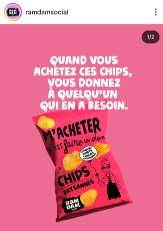 - Le premier visuel fait figurer un paquet de chips commercialisé par l’annonceur Ramdam Social, accompagné du slogan « Quand vous achetez ces chips, vous donnez à quelqu’un qui en a besoin ».