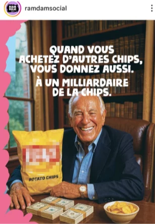 - Le second visuel représente un homme tenant un paquet de chips dont le logo est flouté, accompagné du slogan « Quand vous achetez d’autres chips, vous donnez aussi. A un milliardaire de la chips. ».