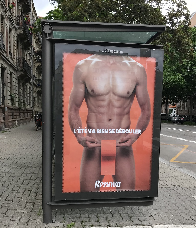 La nudité est ensuite associée au slogan lui-même, basé sur un jeu de mots précisant « l’été va bien se dérouler ». En été, les individus sont en général sur les plages ou au bord des piscines, en maillot de bain (donc torse nu et jambes nues). Le jeu de mots est en lien également avec la période qui vient d’être traversée ou plutôt les périodes qui viennent d’être traversées : confinement, couvre-feu… où le papier toilette était la star des journaux télévisés suivi du déconfinement total e du retour aux libertés ! Le papier toilette se déroule bien… tout comme l’été qui s’annonce. La nudité s’inscrit donc dans le registre de la parodie et de l’humour.