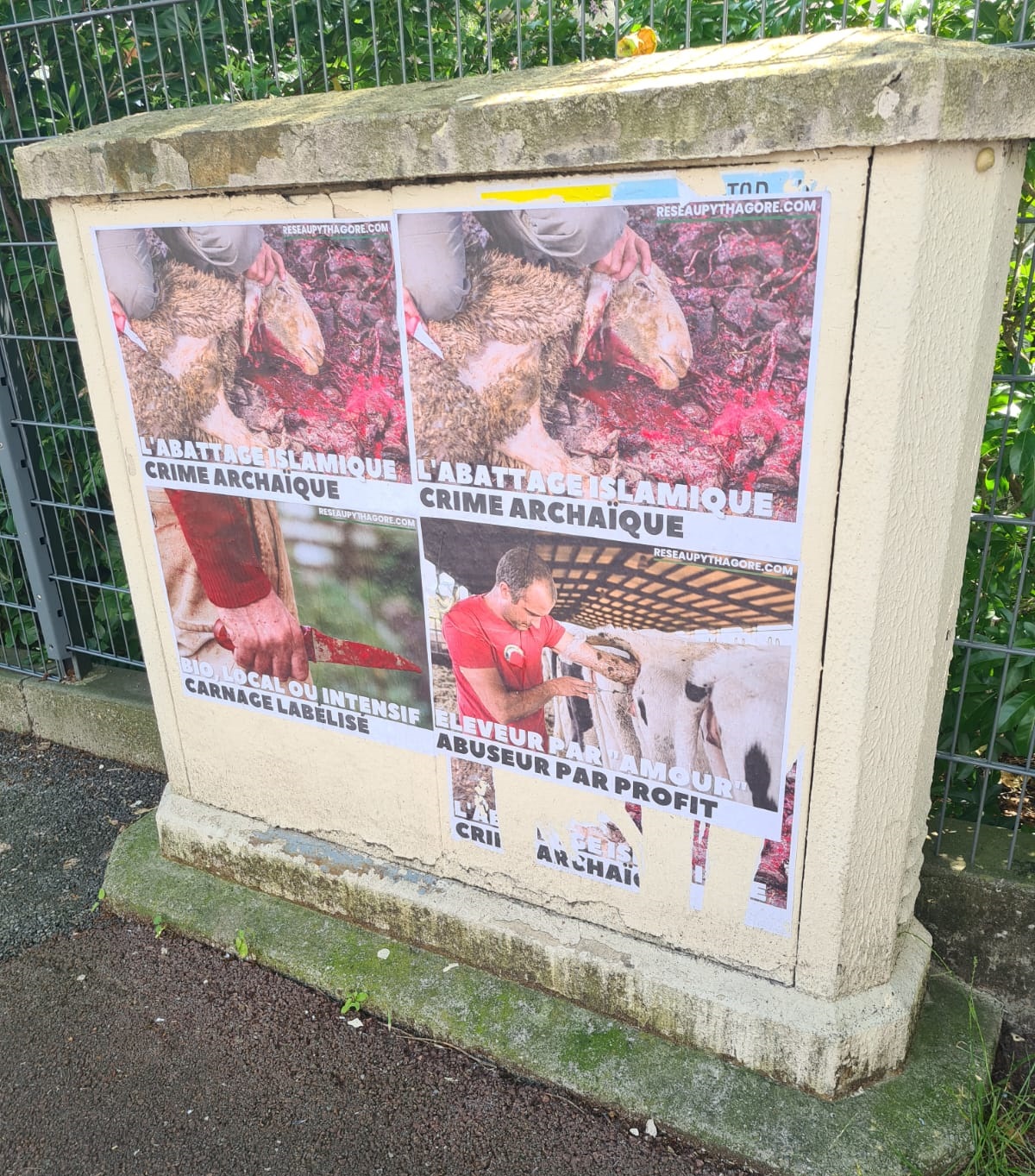 - un mouton maintenu au sol par des genoux d’homme, égorgé, du sang et des viscères répandus au sol. Le texte accompagnant cette image est « L’abattage islamique – crime archaïque »